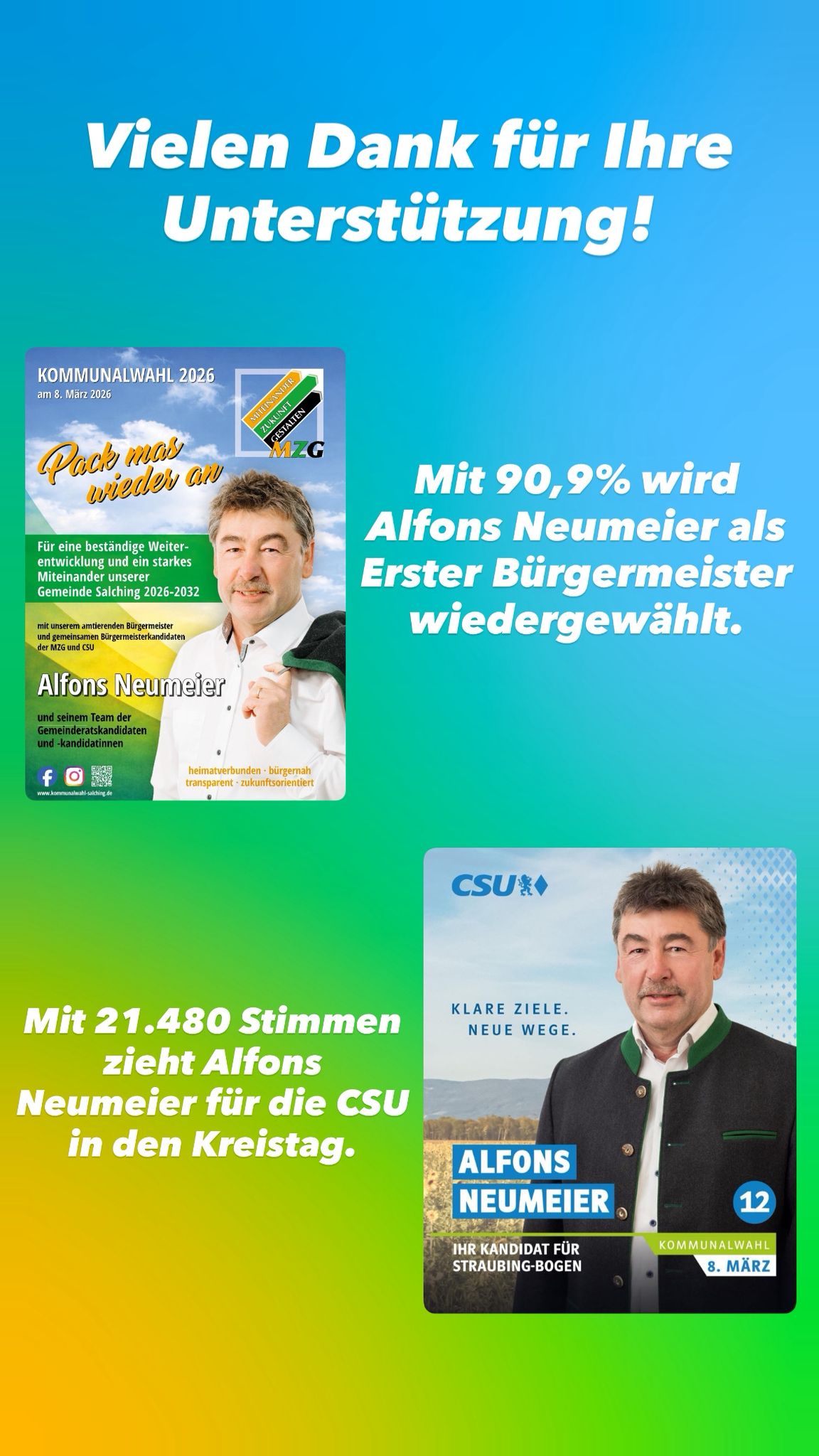 Mit der Wahl von Alfons Neumeier zum Bürgermeister sowie dem starken Ergebnis im Gemeinderat sehen wir dieses Wahlergebnis als klaren Auftrag, unsere Gemeinde weiterhin engagiert, sachlich und mit Blick auf das Gemeinwohl weiterzuentwickeln.