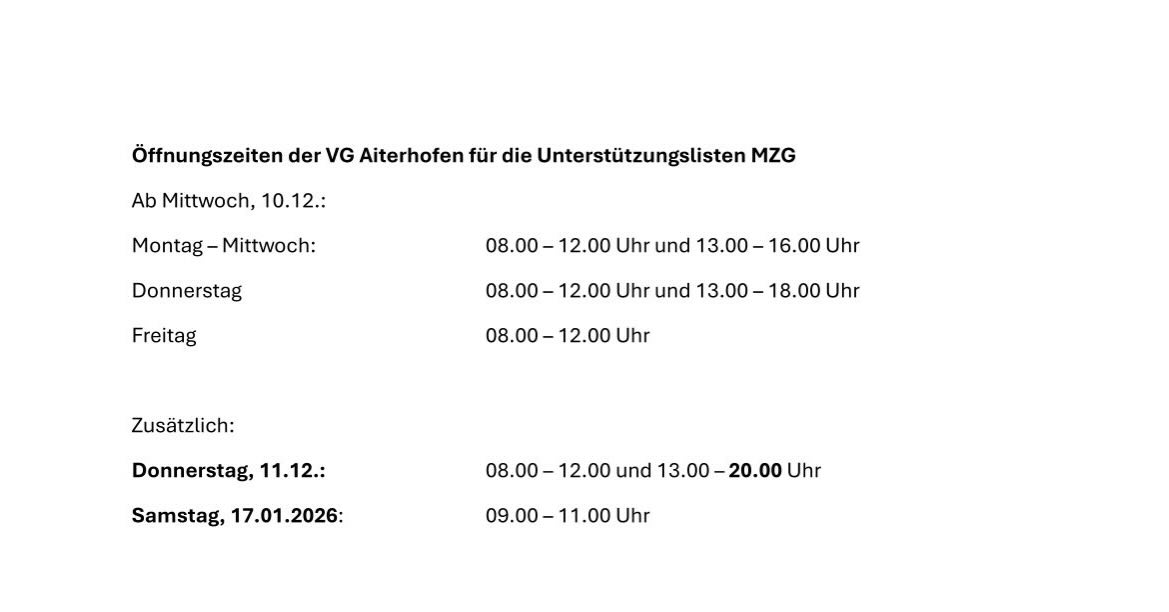 Wahlberechtigte Bürgerinnen und Bürger, die noch keine Unterstützungsunterschrift für einen anderen Wahlvorschlag geleistet haben, können die MZG persönlich unterstützen. Die Eintragung ist nur vor Ort im Rathaus der VG Aiterhofen möglich und erfolgt unter Vorlage eines gültigen Personalausweises oder Reisepasses.